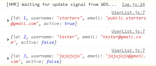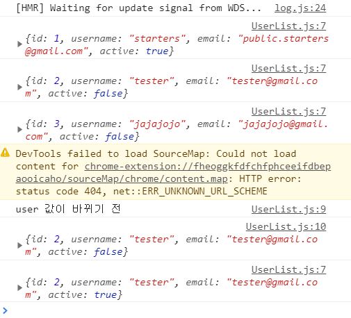 function User({ user, onRemove, onToggle }){ const {username, email, id, active} = user; useEffect(() => { console.log(user); }, [user]);[user]을 넣으면 user값이 변경될 때마다 이 함수 호출하게 된다.(처음 마운트 될 때도 포함)