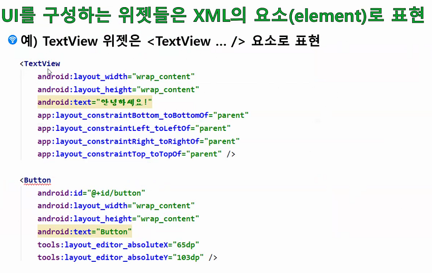 각 요소안의 속성들을 통해 UI 만든다 XML 코드 분석