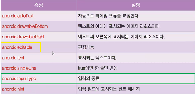 <?xml version="1.0" encoding="utf-8"?> <LinearLayout xmlns:android="http://schemas.android.com/apk/res/android" android:layout_width="match_parent" android:layout_height="match_parent" android:orientation="vertical" > <EditText android:id="@+id/edit1" android:layout_width="wrap_content" android:layout_height="wrap_content" android:hint="아이디" android:inputType="text" /> <EditText android:id="@+id/edit2" android:layout_width="wrap_content" android:layout_height="wrap_content" android:hint="패스워드" android:inputType="numberPassword" /> <EditText android:id="@+id/edit3" android:layout_width="wrap_content" android:layout_height="wrap_content" android:hint="010-XXXX-XXXX" android:inputType="phone" /> </LinearLayout>