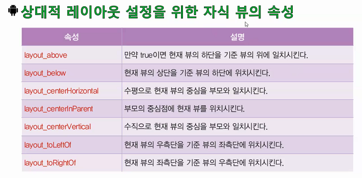 <?xml version="1.0" encoding="utf-8"?> <TableLayout xmlns:android="http://schemas.android.com/apk/res/android" android:layout_width="match_parent" android:layout_height="match_parent" > <TableRow> <TextView android:text="주소"/> <EditText android:text="인천시 부평구 안남로260"/> </TableRow> <TableRow> <TextView android:text="이름"/> <EditText android:text="김응민"/> </TableRow> <TableRow> <Button android:text="저장"/> <Button android:text="취소"/> </TableRow> </TableLayout>상대적 레이아웃