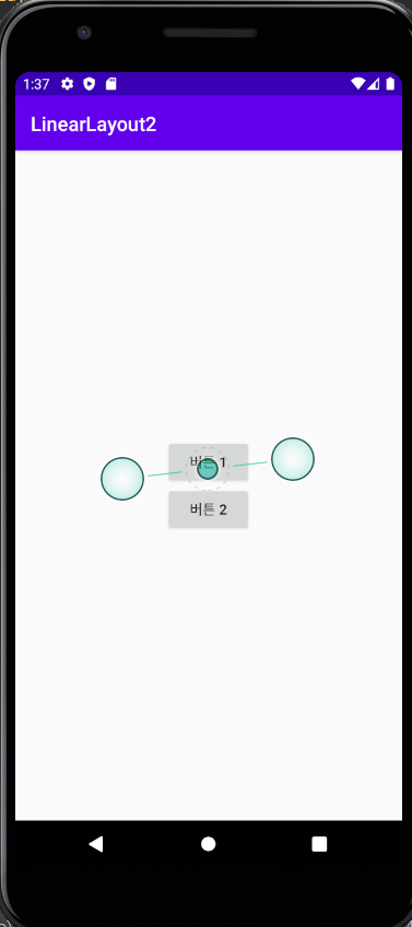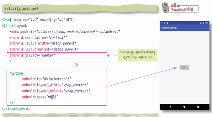 <?xml version="1.0" encoding="utf-8"?> <LinearLayout xmlns:android="http://schemas.android.com/apk/res/android" android:orientation="vertical" android:layout_width="match_parent" android:layout_height="match_parent" android:gravity="center" > <Button android:id="@+id/button01" android:layout_width="wrap_content" android:layout_height="wrap_content" android:text="버튼 1"/> <Button android:id="@+id/button02" android:layout_width="wrap_content" android:layout_height="wrap_content" android:text="버튼 2"/> </LinearLayout>