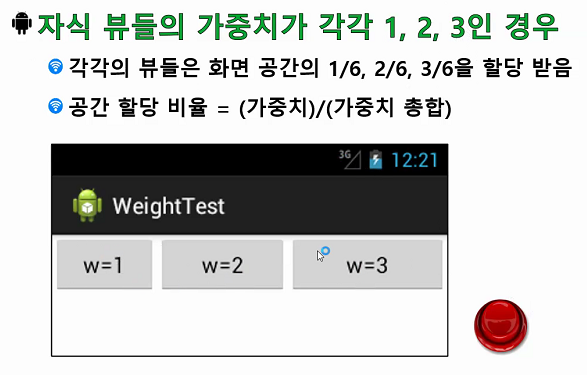 <?xml version="1.0" encoding="utf-8"?> <LinearLayout xmlns:android="http://schemas.android.com/apk/res/android" android:orientation="horizontal" android:layout_width="match_parent" android:layout_height="match_parent" > <Button android:id="@+id/button01" android:layout_width="wrap_content" android:layout_height="wrap_content" android:text="버튼 1"/> <Button android:id="@+id/button02" android:layout_width="wrap_content" android:layout_height="wrap_content" android:text="버튼 2"/> <Button android:id="@+id/button03" android:layout_width="wrap_content" android:layout_height="wrap_content" android:text="버튼 3"/> </LinearLayout>예제 2