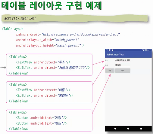 - TableRow 요소 안에 포함된 뷰의 개수만큼 테이블의 열의 개수 생성