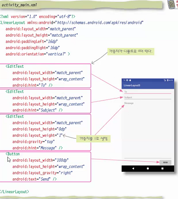 <?xml version="1.0" encoding="utf-8"?> <LinearLayout xmlns:android="http://schemas.android.com/apk/res/android" android:layout_width="match_parent" android:layout_height="match_parent" android:paddingLeft="16dp" android:paddingRight="16dp" android:orientation="vertical" > <EditText android:layout_width="match_parent" android:layout_height="wrap_content" android:hint="To" /> <EditText android:layout_width="match_parent" android:layout_height="wrap_content" android:hint="Subject" /> <EditText android:layout_width="match_parent" android:layout_height="0dp" android:layout_weight="1" android:gravity="top" android:hint="Message" /> <EditText android:layout_width="100dp" android:layout_height="wrap_content" android:gravity="right" android:hint="Send" /> </LinearLayout>