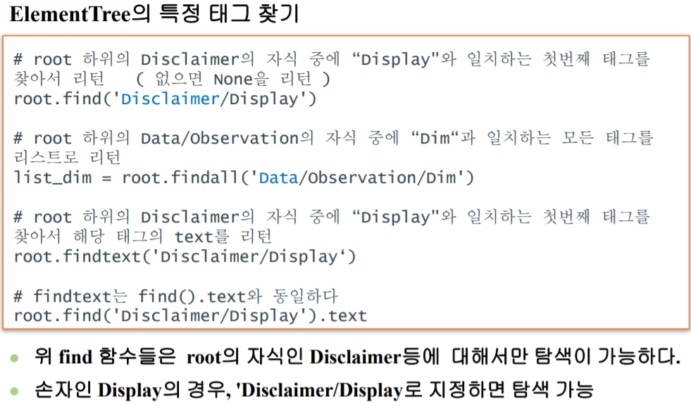 # ex5. findall() list_dim = root.findall('Data/Observation/Dim') print(list_dim[8].attrib)findall()은 리스트를 반환