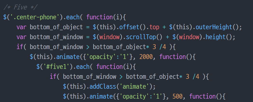 -> JS 파일에서 원하는 때에 애니메이션 나오도록 .addClass('animate')사용해서 원하는 곳에 animate라는 클래스가 추가되도록 한다.