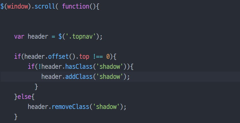 $(window).scroll( function(){ var header = $('.topnav'); if(header.offset().top !== 0){ if(!header.hasClass('shadow')){ header.addClass('shadow'); } }else{ header.removeClass('shadow'); }'Javascript' 카테고리의 다른 글